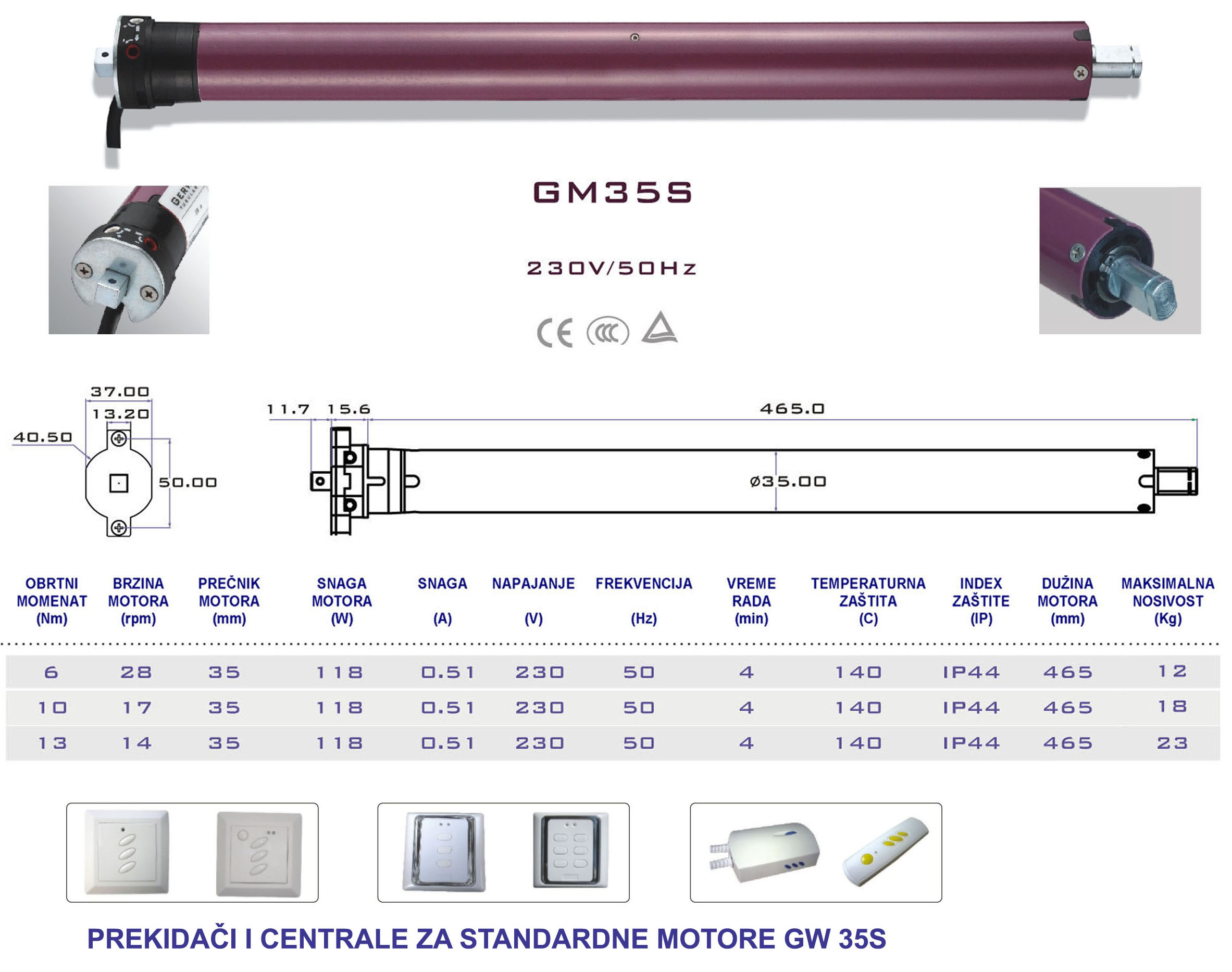 Standardni motori se moraju povezati sa prekidačem koji se stavlja na ili u zid , koji je istovremeno risiver za daljinski upravljač.Kod ovih motora podizanje , spuštanje i zaustavljanje može biti regulisano i preko prekidača i preko daljinskog upravljača.Motori poseduju mogućnost za odredjivanje krajnjih položaja.