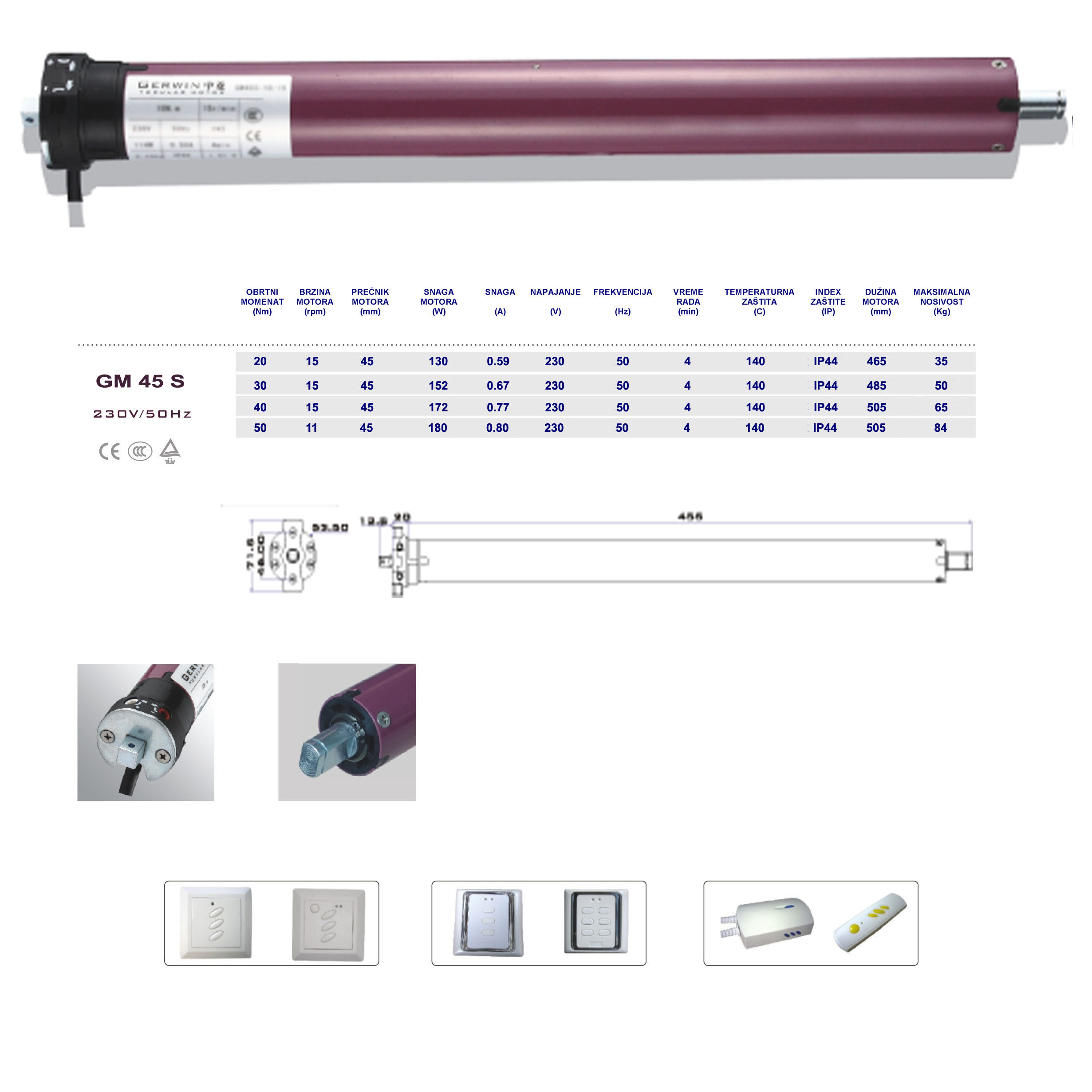 Standardni motori se moraju povezati sa prekidačem koji se stavlja na ili u zid , koji je istovremeno risiver za daljinski upravljač.Kod ovih motora podizanje , spuštanje i zaustavljanje može biti regulisano i preko prekidača i preko daljinskog upravljača.Motori poseduju mogućnost za odredjivanje krajnjih položaja.Ugradjuju se u čeličnu osmougaonu oklagiju fi 60.
